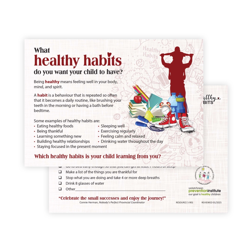 This postcard defines “healthy” and “habit” and asks the question, “Which healthy habits is your child learning from you?” Examples of healthy habits are listed. A provided activity encourages parents and caregivers to select one new healthy habit that they wish to role model for their children.