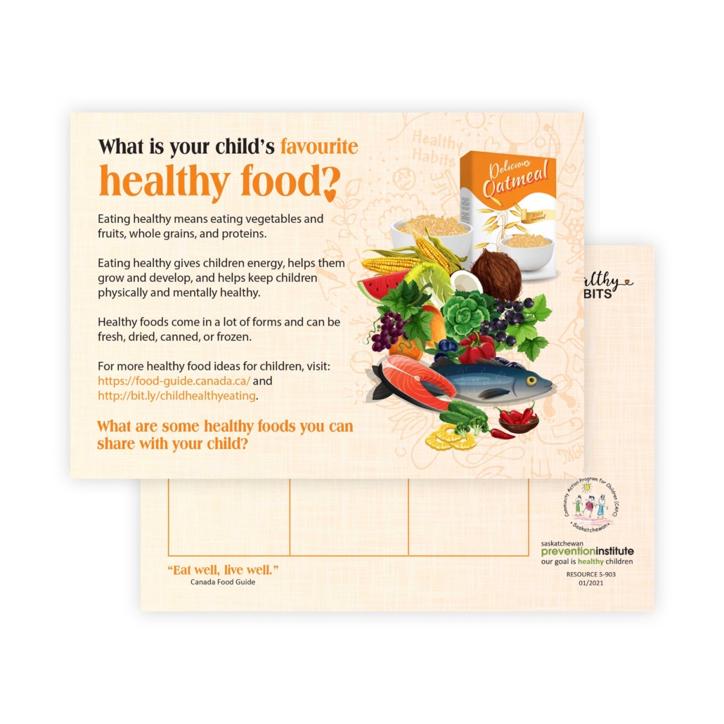 This postcard highlights what healthy eating means and why it is important for children to eat healthy foods. It also provides space to list examples of healthy foods.