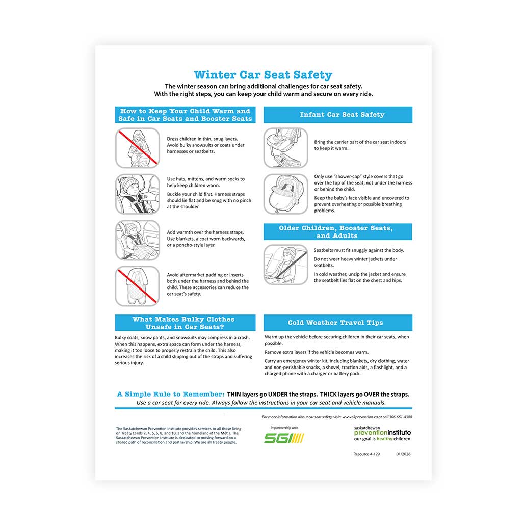 This fact sheet shares key winter car seat safety tips, including how to keep children warm without affecting proper harness fit. It provides guidance for infant car seats, along with important reminders for booster seats and older children. It also explains the risks of bulky clothing and offers practical tips for cold-weather travel.